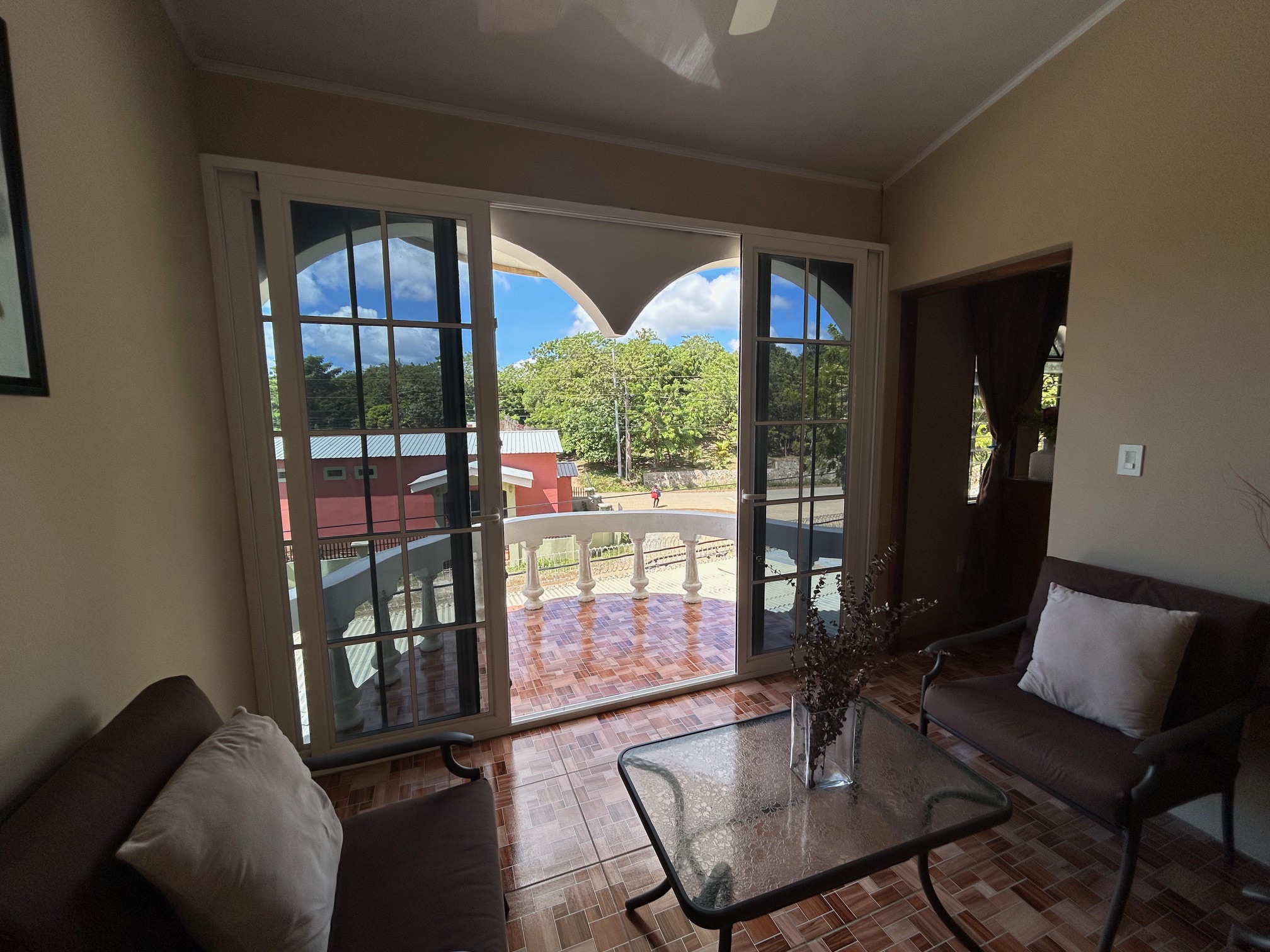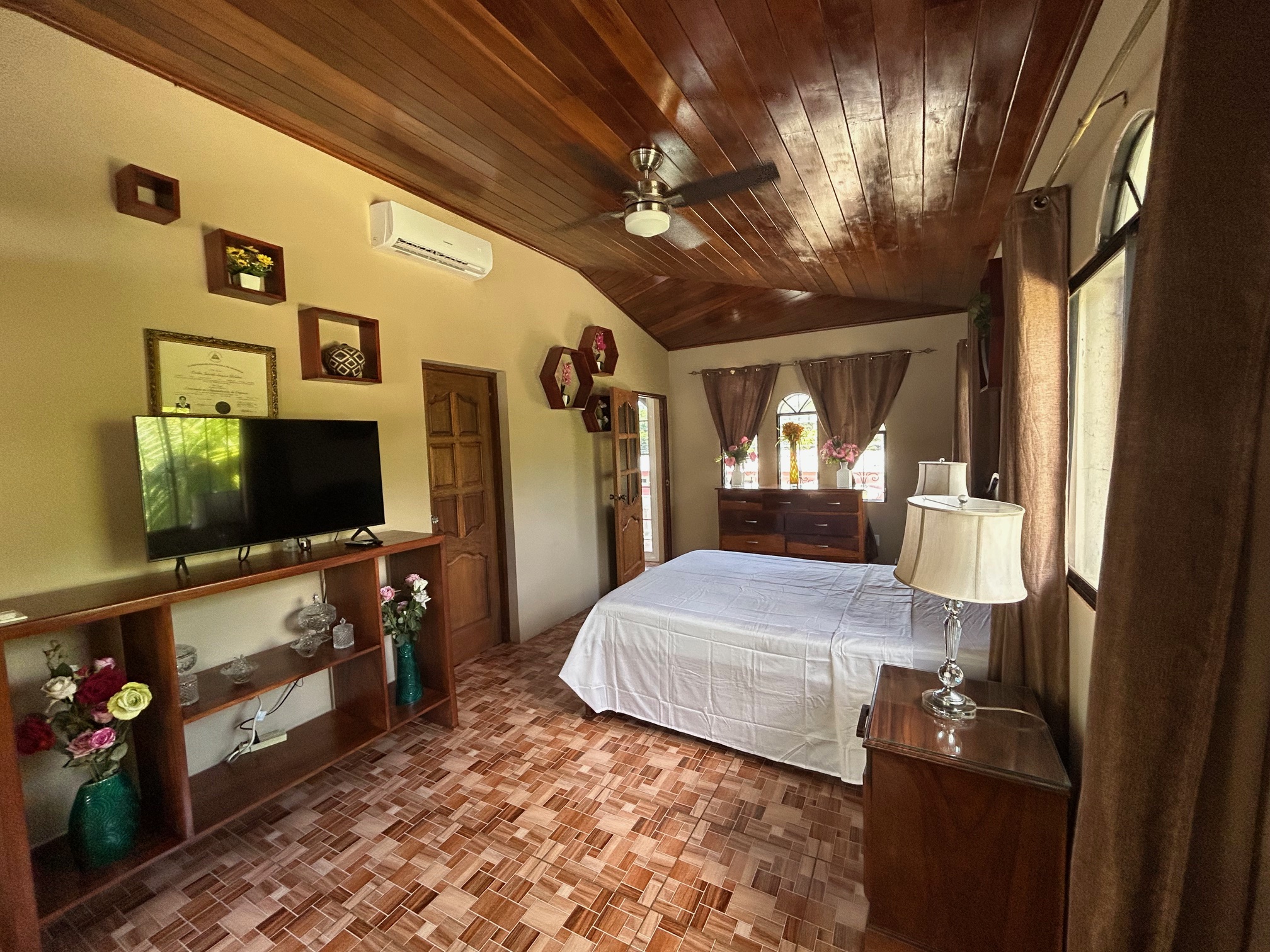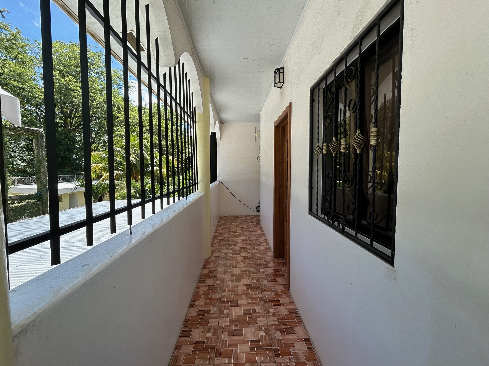 The upper floor separates this property from a standard commercial investment. Three bedrooms, two bathrooms, and a covered indoor/outdoor balcony create living quarters that function as a proper home rather than an afterthought. All three bedrooms include air conditioning, which is a detail that matters in this climate and one that guests and residents alike notice immediately.