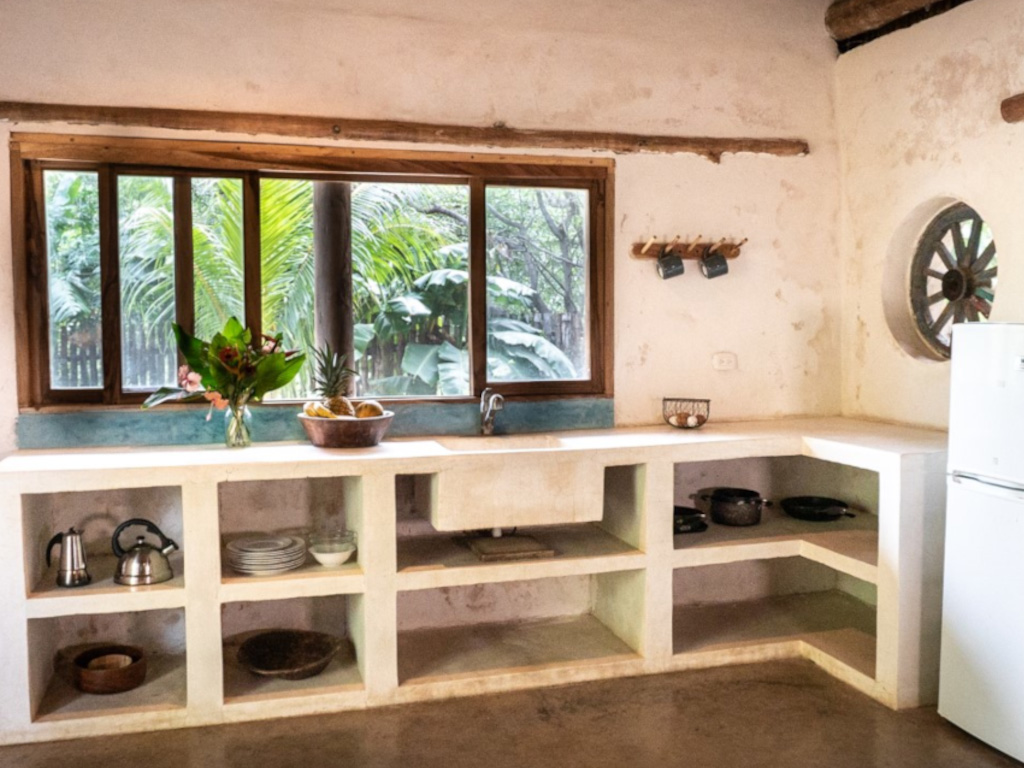 Each of the three bungalow-style casitas follows the same generous design. The ground floor opens into a wide, light-filled living space with a fully equipped kitchen that invites cooking rather than just allowing it. Natural ventilation keeps the space cool without running air conditioning all day. Guests who stay here often remark on how different the air feels compared to a standard rental. That is not chance, but rather, the direct result of walls built from materials that let moisture pass through rather than trap it.