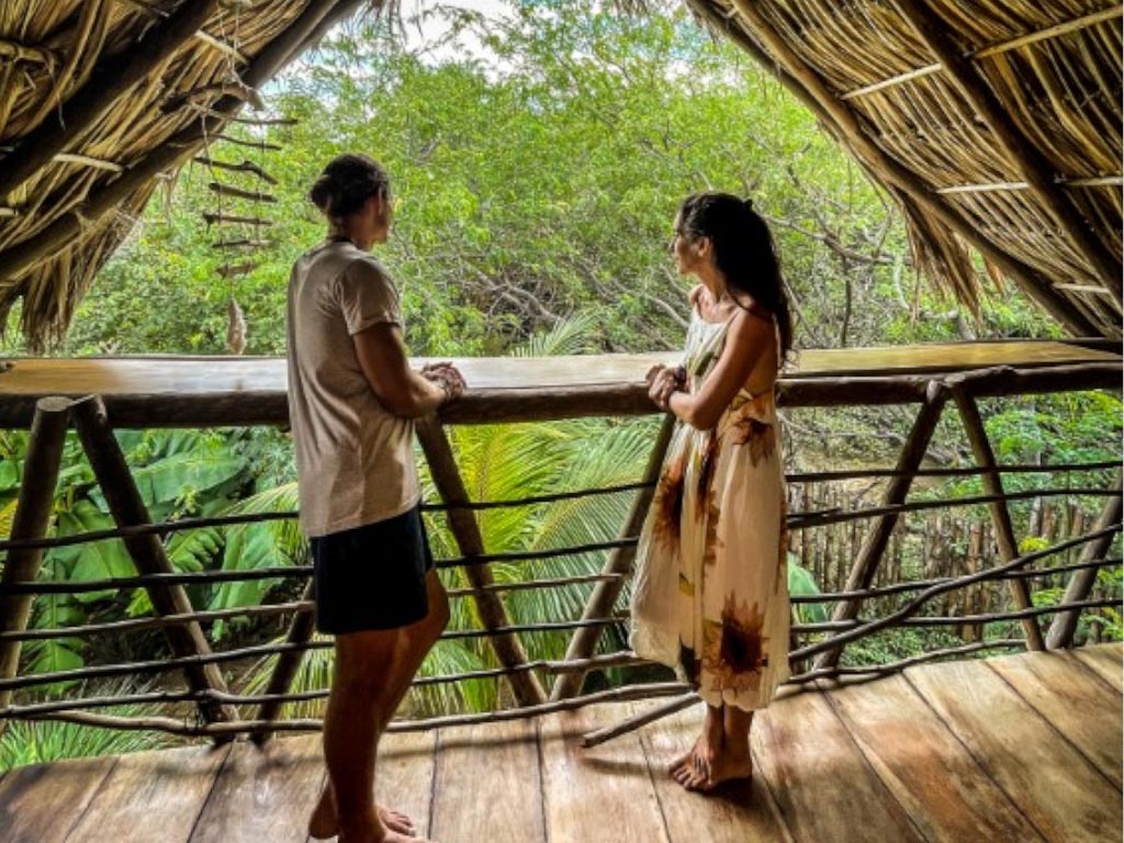 Tierra Nahua Eco Lodge in Popoyo features three eco-friendly casitas and a spacious covered community area just 150 meters from Playa Jiquelite. Each casita includes an open-concept living space with a fully equipped kitchen, plus a second-floor bedroom and private balcony.
