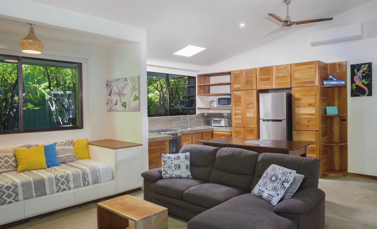 The interior hits differently than most properties at this price point. The stilt construction lifts the home off the ground and pulls consistent airflow through the living spaces. As a result, the home stays naturally cool without relying solely on mechanical cooling. Both bedrooms and the living room are additionally air-conditioned, so comfort is covered regardless of conditions outside.